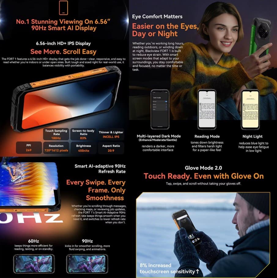 Blackview Fort 1 оснащений 6.56-дюймовим IPS дисплеєм з роздільною здатністю 1612 × 720 пікселів (HD+). Частота оновлення 90 Гц забезпечує плавну прокрутку меню та комфортний перегляд відео. Екран захищений міцним склом Panda Glass, що підвищує стійкість до подряпин і пошкоджень.