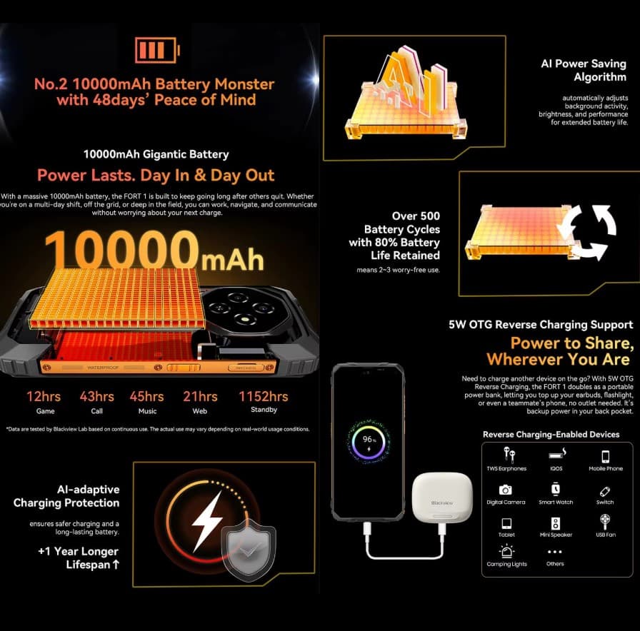 Однією з головних переваг моделі є потужний акумулятор 10000 мАг, який забезпечує тривалий час автономної роботи. Смартфон може працювати кілька днів без підзарядки навіть при активному використанні.